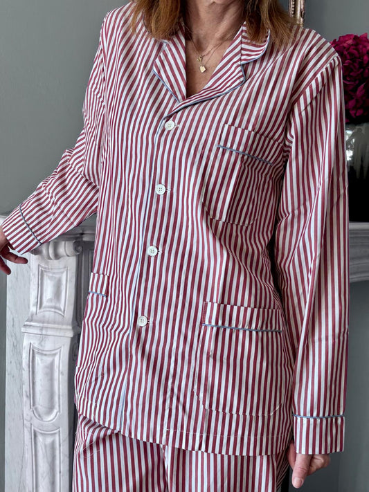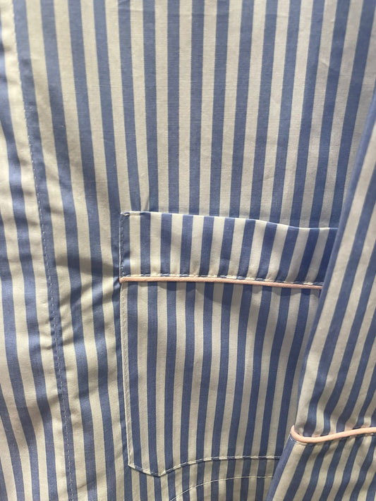 Pigiama spezzato riga larga celeste con tasche a contrasto Liberty