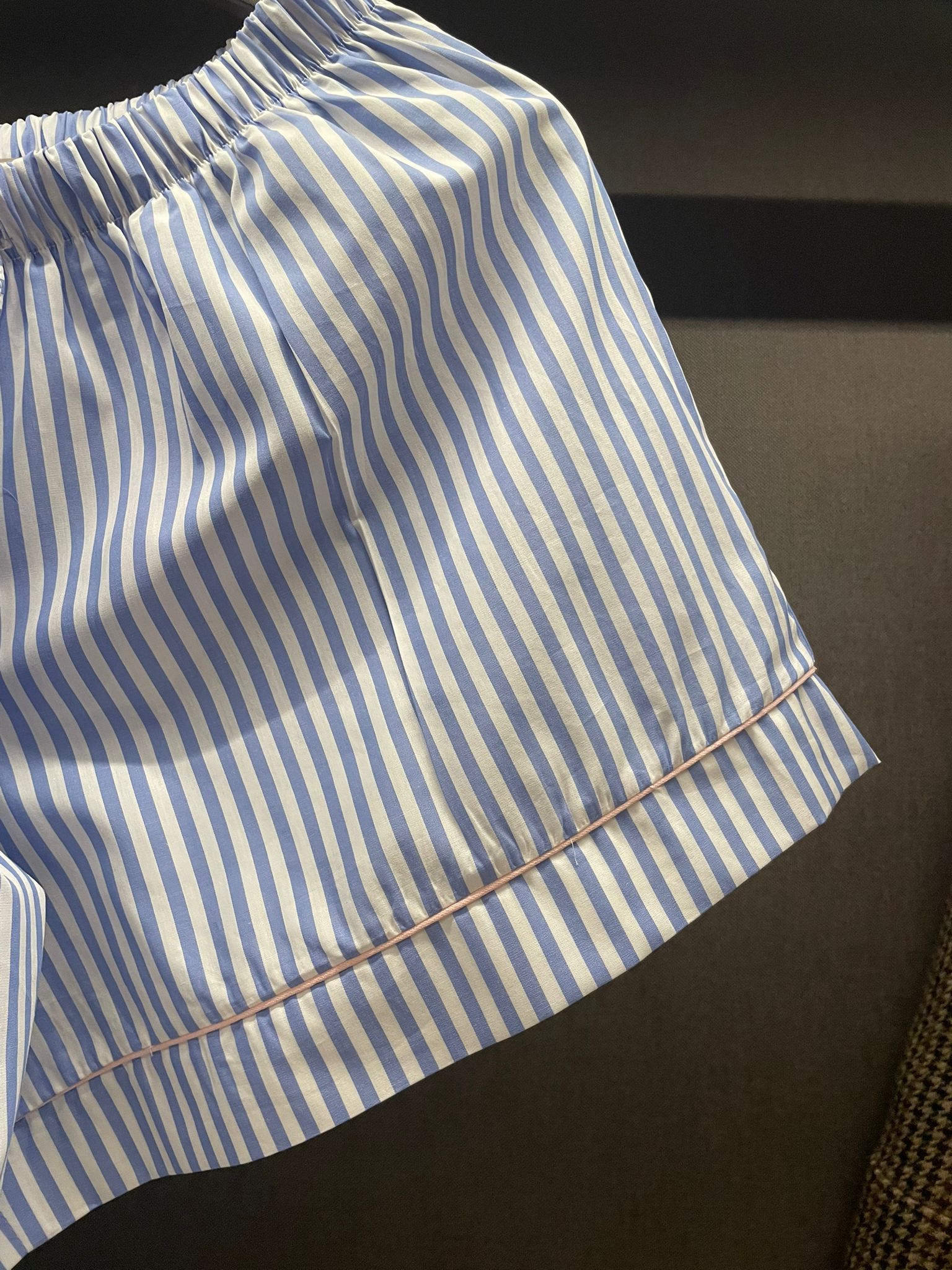 Pigiama donna spezzato corto in popeline con riga celeste e piping rosa.