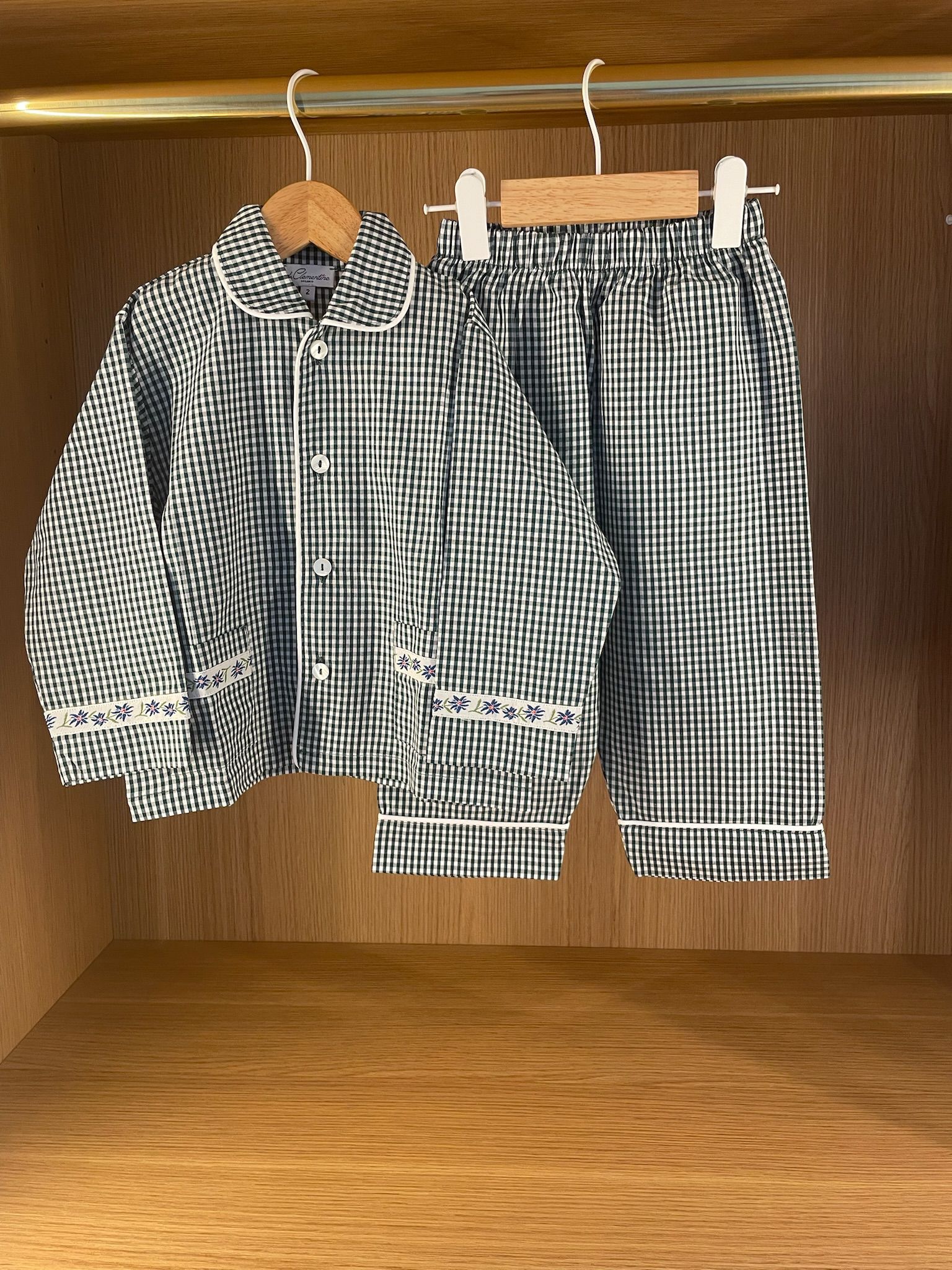 Pigiama spezzato in popeline a quadretti verde con passamaneria tirolese.