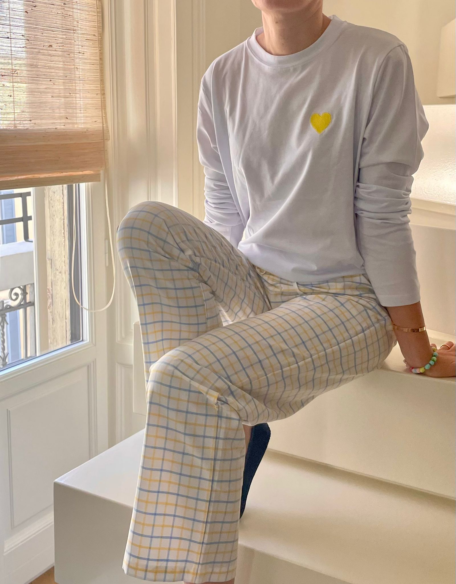 Pigiama spezzato t-shirt con ricamo cuore giallo e pantaloni a quadri gialli e celeste.