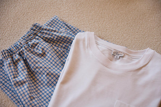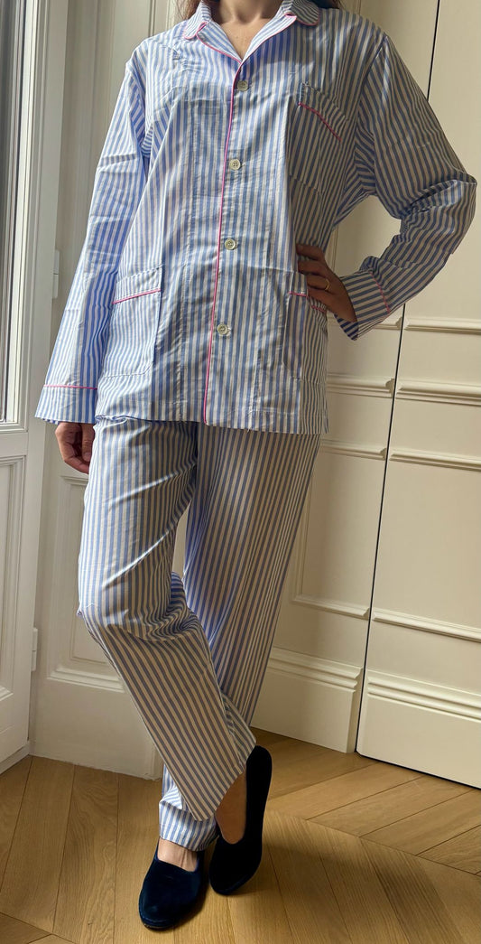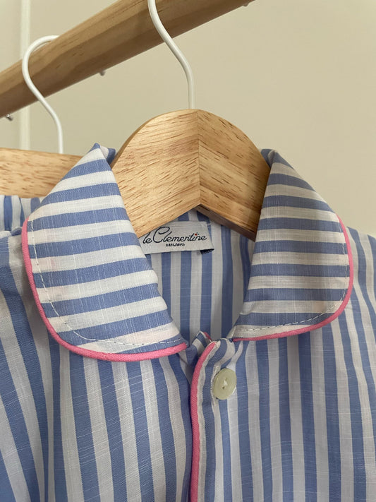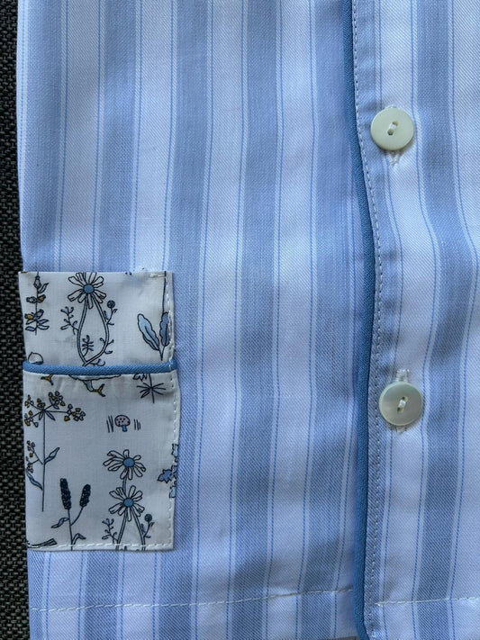 Pigiama spezzato riga larga celeste con tasche a contrasto Liberty