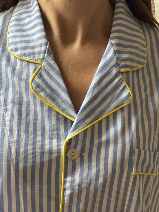 Pigiama spezzato riga larga celeste con piping giallo a contrasto